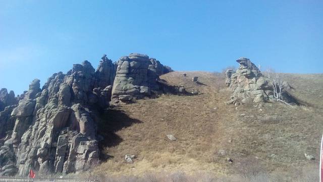 涛哥在乌兰浩特租了个越野车,带我随处走。玫瑰峰在白天也就是一堆破石头,但傍晚我们从七仙湖草原回来时才看到玫瑰峰的风采,在夕阳下通体呈现出梦幻的暗红色。