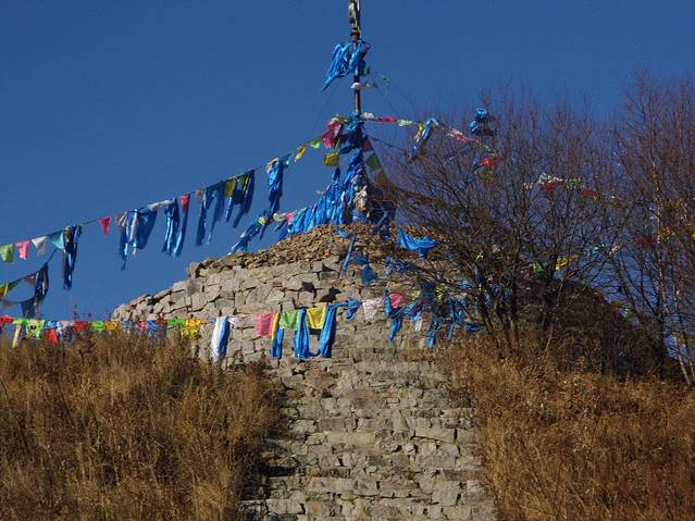 蒙古敖包,原来是在辽阔的草原上人们用石头堆成的道路和境界的标志,后来逐步演变成祭山神、路神和祈祷丰收、家人幸福平安的象征。