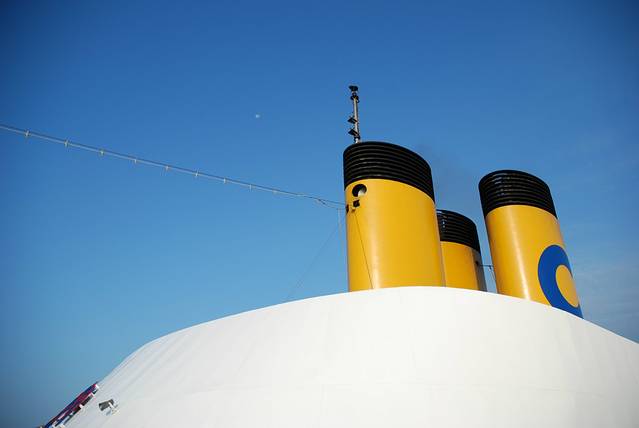 歌诗达标志性的烟囱,黄色底配上大大的C