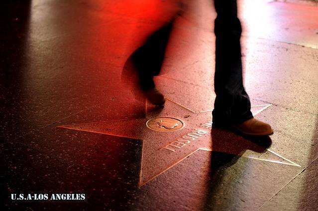 夜色下的星光大道。这些名人的名字永铸于地上,行人却从上面匆忙走过。注:这双脚是我老婆的,哈!