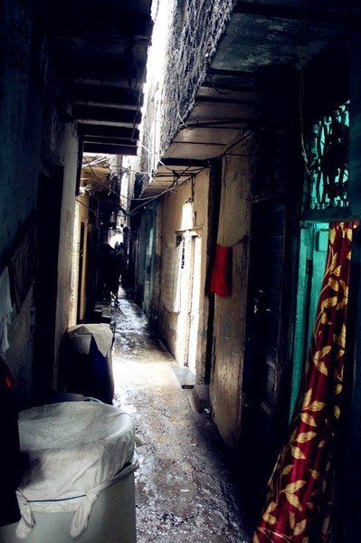 狭窄的走道暗无天日,只能并行最多2人,从房子中间透下一丝光线,