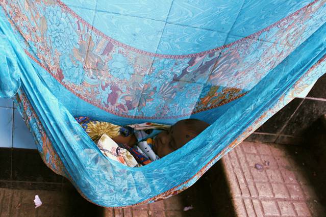 人行过道挂了个宝宝睡在这里,父母都不知道在哪,可能在附近做生意吧,宝宝睡的很香甜