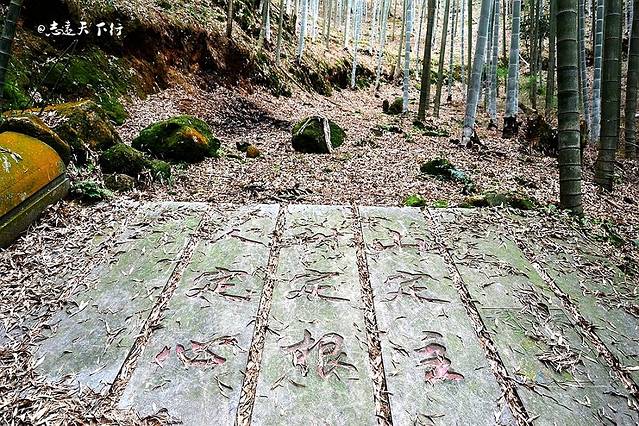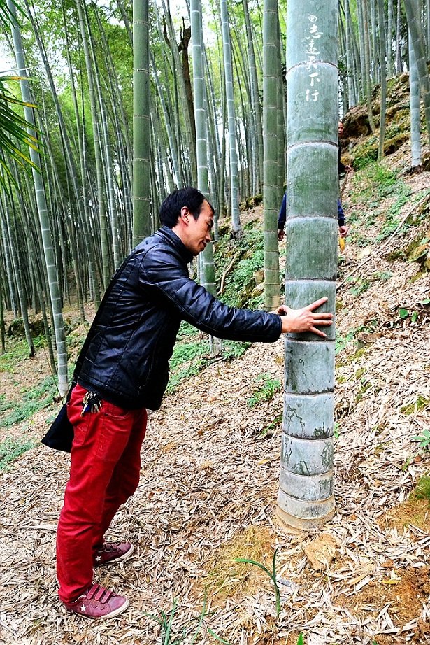 3、作为竹子现代科技园区的核心地,杨大叔的竹林地是园区中较为不错的一片,不仅竹子胸径比一般的林区大,每年的竹笋产量也是其中的佼佼者。竹林地修有水泥台阶供游人行走参观。这处写有“人定心,树定根,山定主”的水泥板,想必也是说出种竹人的一种心境吧。