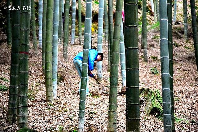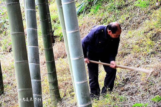 2、经当地摄影协会罗主任的介绍安排,我们来到园区旁杨大叔家的竹林地。杨大叔家住在三公里外的上坪乡龙共村,十年前,林权制度改革,把竹山经营权,毛竹所有权落实到农户,杨大叔家分到了这一百多亩的竹林地。近几年,九龙竹海被开发成景区,也新修了公路,他们家的竹林地做为竹子现代科技试验地,每年光是卖竹子、冬笋、春笋和其它的果林,就能有二三十万的创收。