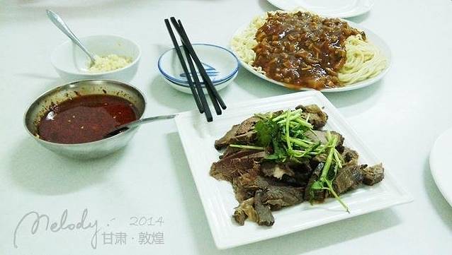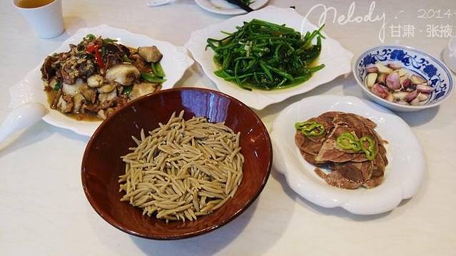 面和肉,面面面。相比同样都是面食为主的西安,品种少很多。食物口味嘛……就是……只为填饱肚子的水平。当然,也是因为没特别去找美食咯,火车上遇到的当地食家大哥推荐羊肉,下次吧。 相比之下,张掖的特色食物多一些、好吃一些。