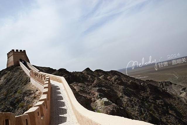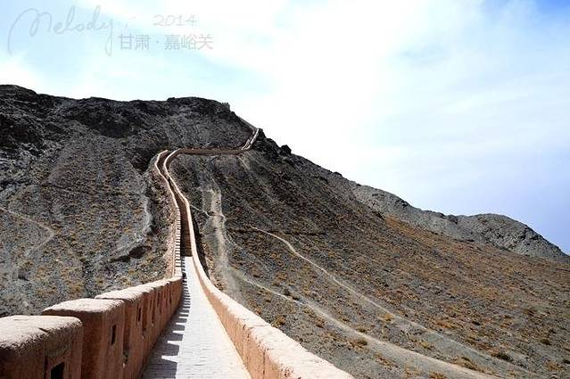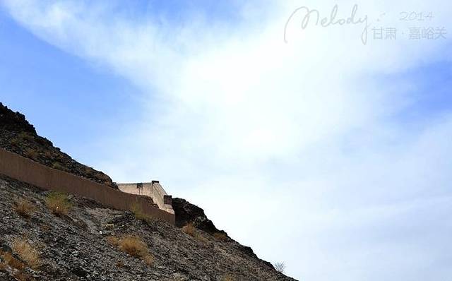 悬壁长城:明嘉靖十八年(1539年)由肃州兵备道李涵监筑,此段长城从关城东闸门边的角墩起向北延伸至黑山山腰,全长7.5公里。山腰长城约750米,陡峭直长,气势雄伟,垂若悬臂,故有“西部八达岭”之称。(摘自网络)