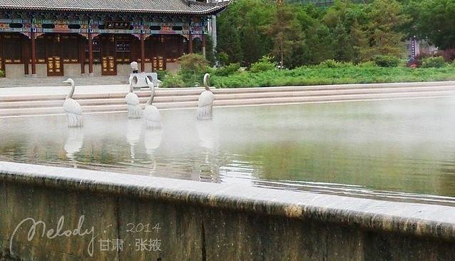 大佛寺一大门外有座蛮特别的喷水池,喷出的是水雾,营造出云雾缭绕的气氛,很仙!