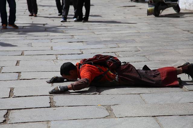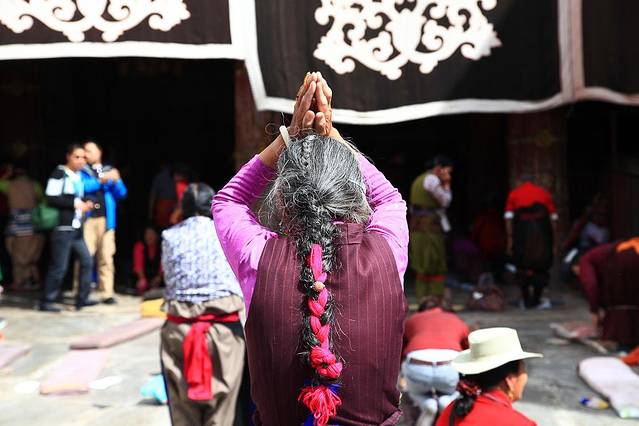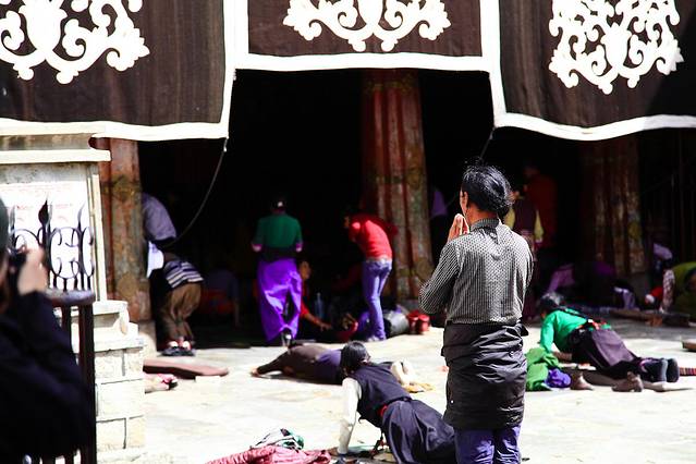 大昭寺门口常年都聚集着来着全国各藏区的信徒来这里朝拜