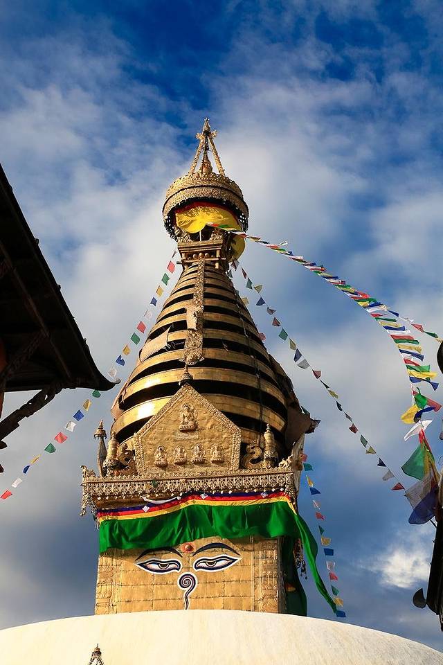 主建筑是一座巨型的舍利塔,塔身为圆锥型,底座为四方形,底座四面绘有眼睛的图案,这是“智慧的眼睛”,能够看到世间一切,象征着佛眼法力无边,能看着加德满都的每个角落。