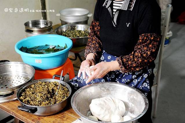 菜花团子的外衣,则以纯糯米粉揉制。糯米富含B族维生素,能温暖脾胃,补益中气,是一种温和的滋补品,有补虚、补血、健脾暖胃、止汗等功效。糯米粉加水揉捏均匀成一个光滑的面团,再分成一个个约1两左右的剂子。随后,巧手的老阿姨便开始了指尖魔法,娴熟的搓揉、压扁、包入菜馅、收口团好一气呵成,不出几秒钟,一个雪白圆润的菜花团子就做好了。白团子下再配上一小方翠绿的粽叶托底,颜色煞是清爽喜人,还避免了蒸煮时粘锅。