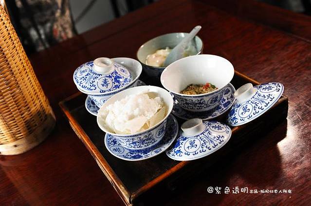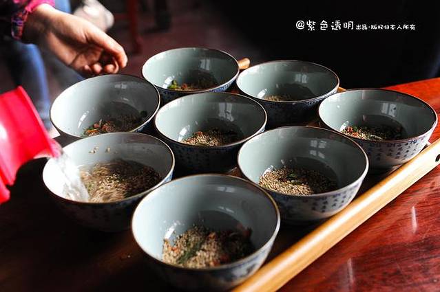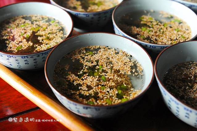 第二碗叫“熏豆茶”,主要用料是寻都和茶叶,再辅以炒熟的芝麻,晒干的胡萝卜和橘子皮,还有新鲜的震泽黑豆腐干之类,味道有点咸。这道茶特点是多色多味,乡土气息浓郁。