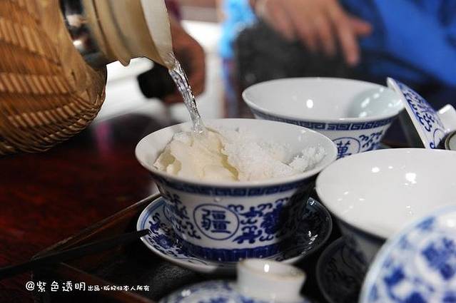 第一碗叫“待帝茶”,一般是招待贵客,或者带第一次上门的新客及来访的亲戚的。但这却是一道不用茶叶的茶礼,只是贩糍干加糖冲上开水即成。