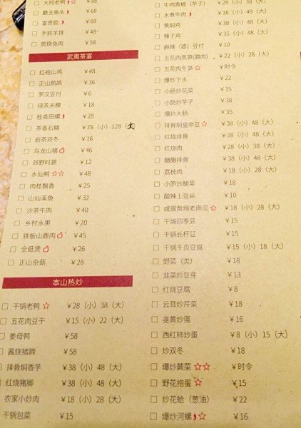 这是菜单,明码标价,不存在担心景区“宰人”的担忧哈。而且分量很足,武夷茶宴那个主题下的菜都很不错!我们点了4菜一汤,总共一百多,人均只有三四十,吃得很饱!给个大大的赞!