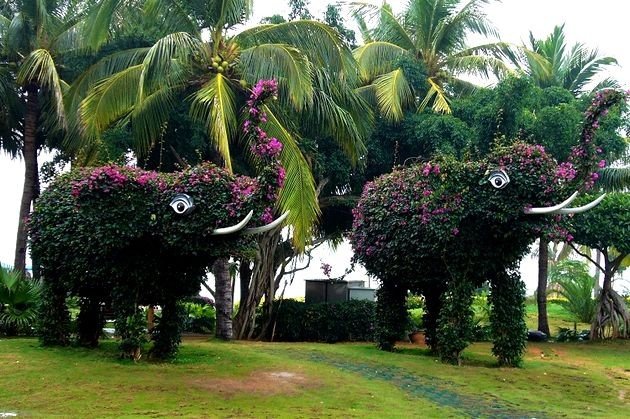 天涯何处无芳草,椰风海韵共成辉”,经过爱情广场就进入的是笆篱凝霞景区。这里生长着许多热带的特色植物,花木错落有致,碧草相映成荫,奇花异树争相斗艳与碧海蓝天相应相和,形成了独具匠心的热带景观。夕阳映海的日暮时分更是壮美无边,放眼望去椰林奇树幻化成曼妙的的剪影,透过它们婆娑的姿态看那红霞满天,波光满目真是说不出的震撼人心,可谓是:霞映云天飞鸟远,椰风树影也成观。“笆篱凝霞”这一诗意的美称便是由此而来,美景自不必说,这里还有奇石、题刻,渗透着浓厚的人文气息,与椰风海韵和谐统一,相应成章。