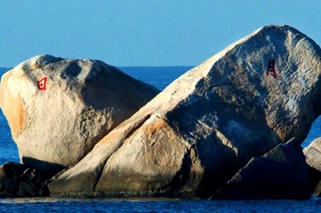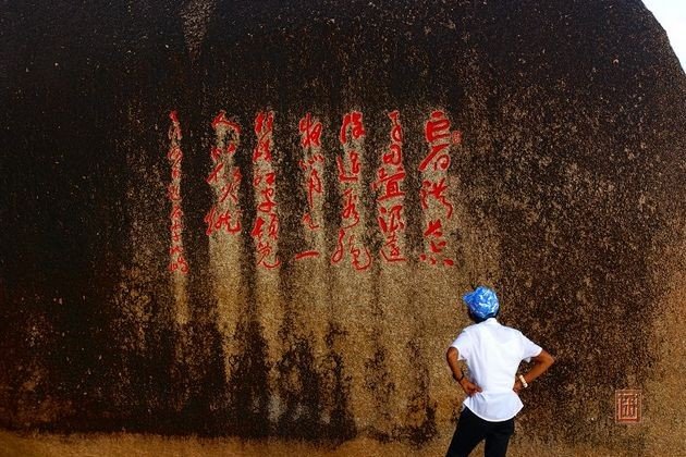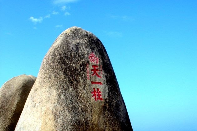 这尊高大耸立的圆锥形奇石,象一支神笔直指苍穹,这便是“南天一柱”石,它高约7米,侧面看像一艘古船上升起的“双桅帆”。它高大、圆润,背倚大海,擎天拔地,有独立南天之势。清代宣统年间崖州知州范云梯所书“南天一柱”四个大字,赤红的颜色,与艳阳底下湛蓝的海水的相映,异常醒目。南天一柱独立于垒石之间,屹立于南海之滨,雄奇壮观,为这柔情的海景增添了几分坚强。1980年和1990年发行的第四套贰元人民币,它的的背面图案就是这“南天一柱”石也就是财富石,与财富石合影或拥抱一下,一定能给大家带来”财运”的。