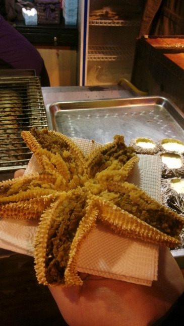 不知不觉我们到了劈柴院,吃了海胆,海星(来之前就想说要试吃这两个,完梦了*^_^*)还有生煎还有蟹黄汤包。。。