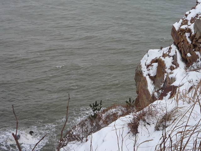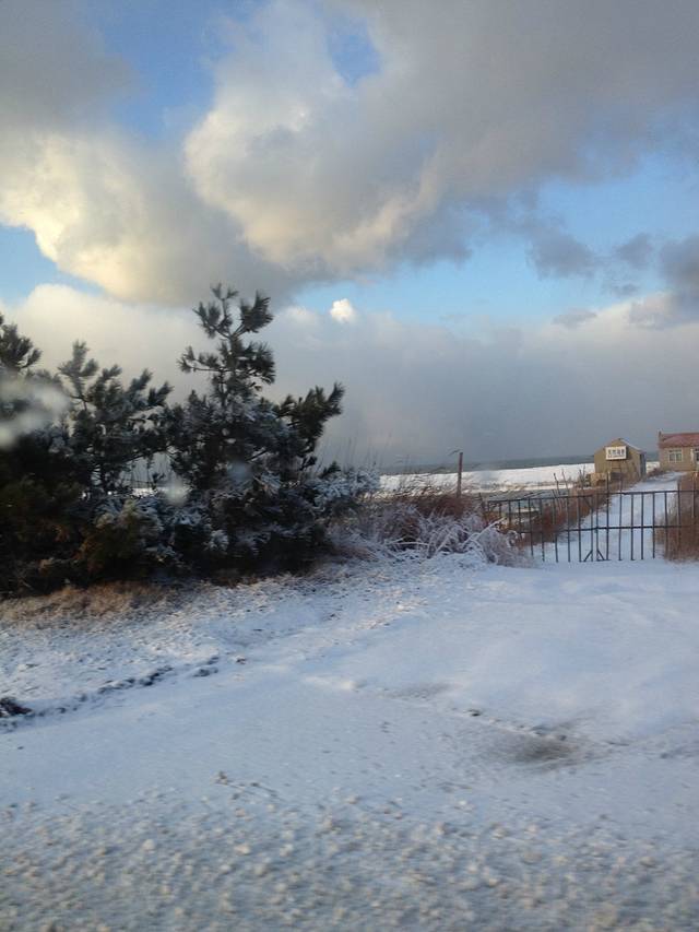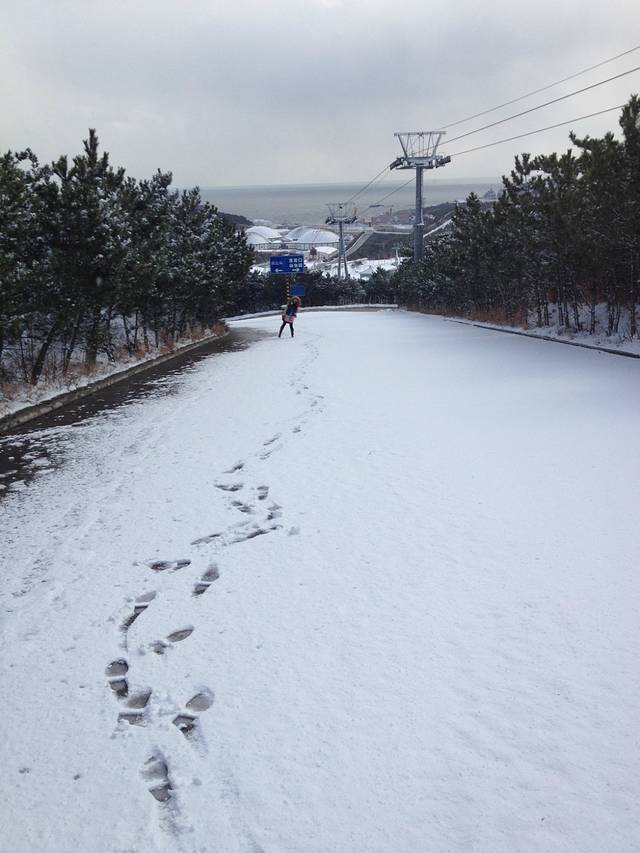 刚从宾馆出来就看到一片白茫茫的景色,好漂亮啊,虽然雪不是很厚,但是足以实现我踩在雪地上吱吱响的愿望了。。。我们今天首先要到成山头售票区坐车,摩天岭才是我们的目的地(我们第一天晚上吃过晚餐后,回去宾馆和老板聊了一下,知道宾馆这里是烟墩角村和成山头的中间位置,无论去那边都得折返,而且耗时不少,只能选择其中一个景点,我们最终决定放弃前往烟墩角村看芦苇丛中的天鹅了o(╯□╰)o)。我们截停了一辆公交车,售票员告诉我们到了终点站走过去就是了(我们以为很近,其实是相当相当相当的远啊!!T^T~~~下了车还要走2.5公里路程,我们都醉了!)也没有等到车,只好走着上去,还在路上看到一辆大货车卡在那里,司机大叔在清理那些雪堆,可能是因为下雪公交都不进来了。半路上我们遇上到一对couple,他们是从济南自驾游过来的,送了我们一程,太感谢了。。。o(≧v≦)o~~ 我们终于到了成山头风景售票区了(但其实噩耗才刚刚开始啊。。。)为了看水晶宫,我们在同程网订了摩天岭的票,但是成山头售票员跟我们说这里风景区的免费车不开放了,缆车也没有了,我们想去的摩天岭只能走路过去,我们想着美丽的水晶宫还是坚持走去那里,一边走一边欣赏沿路风景,路上只有我们倆的脚印,两边都是松树和白茫茫的一片。一个多小时后,我们终于到了“遥远”的摩天岭,进入水晶宫,一眼就看完,通道已经不通了,太空慢步也没有了,弱弱的惋惜了好一阵。。。。欲哭无泪啊!而且我们还得走回去啊。。。早上没有吃什么,一直饿到中午,肚子扁扁的。。。。亲们,在这里奉劝一句,千万不要在冬天去摩天岭啊!/(ㄒoㄒ)/~~