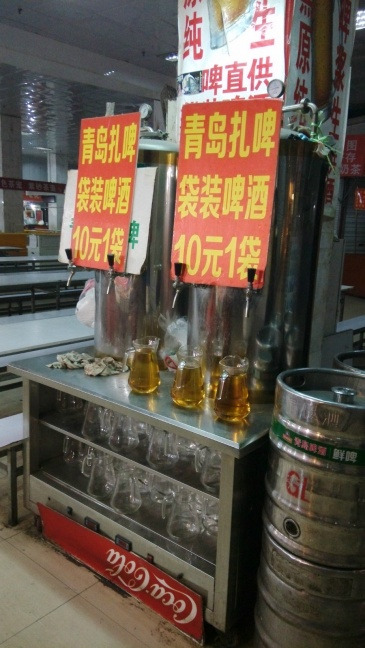 我们从小青岛走出来,到鲁迅公园搭上了231路公交车,到中山路公交站下(1元每人),因为网上说这个加工店不配食材,所以我们先要到市场买食材!问了当地的人,说肥城路附近有个小市场!我们找到了那个市场,原来大胡子啤酒屋也是在这市场旁边的!这市场跟我们平常说的市场不太一样,不像我们熟悉的买卖集中区,只是一条街上,各种买海鲜的店铺!