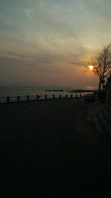 随后,我们带着沉重的心情,搭公交到鲁迅公园,下车后沿着琴屿路一直走。。。(海边风好大啊,想到小青岛那间树上咖啡屋,沉重的心情也悄然散去)听着海浪声,日落好美啊。。。。15分钟后,我们到了售票处。。。售票员竟然告诉我们咖啡屋已经搬走了。。。我们无奈之下只好往回走,经过一间Time Capsule的咖啡店,我们选择了歇歇。。。(这咖啡屋也是比较复古的,人均30-40元)喝着咖啡,外面的景色逐渐暗下来,天黑了。。。