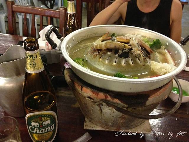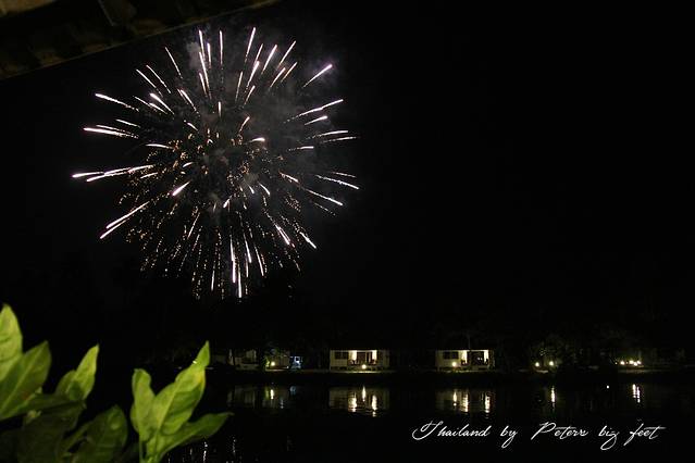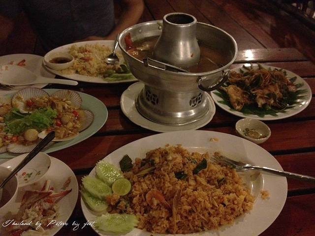 这是一家环境很别致的河边餐厅,我们找了个临河的座位。对于白天赶路中饭没好好吃的我们,点了大份的炒饭,然后。。。。。就悲剧了,真的是超大份啊。。。这盘子都和火锅一般大了,大概是沙县炒饭的3倍量。旁边一桌是一个泰国大家庭集体出来度假,把三张桌子拼了起来。正吃了一半的时候,河对岸放起了烟花。填着肚子看着烟花,吹着晚上温度适宜的河风,赶路的疲惫渐渐散去。