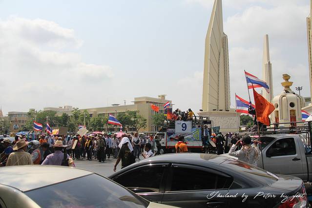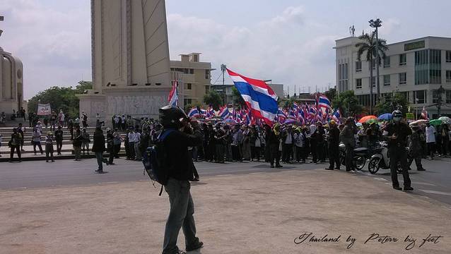 举着国旗的小方阵也出现了,浩浩荡荡跟在摩托、广播车的后面开始游行。大妈大伯,背个背包戴个墨镜披个头巾,有说有笑地走着。如果说红衫军代表的是广大屌丝的利益,那黄衫军代表的就是高富帅的利益,屌丝和高富帅永远都是水火不容的。但是再怎么今天你闹明天我闹,哪天国王出面你们都得歇菜啊。