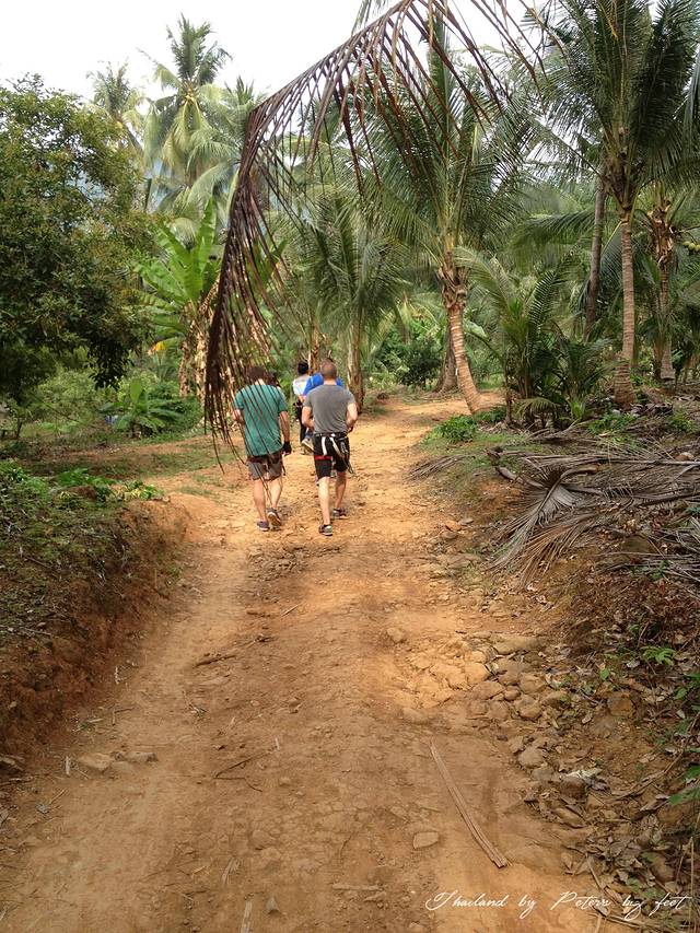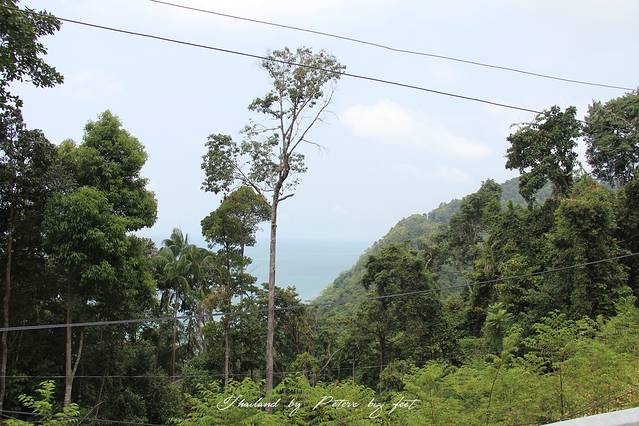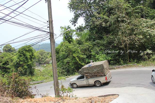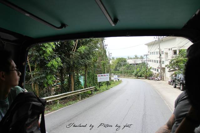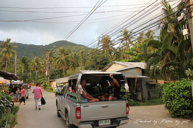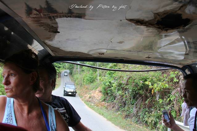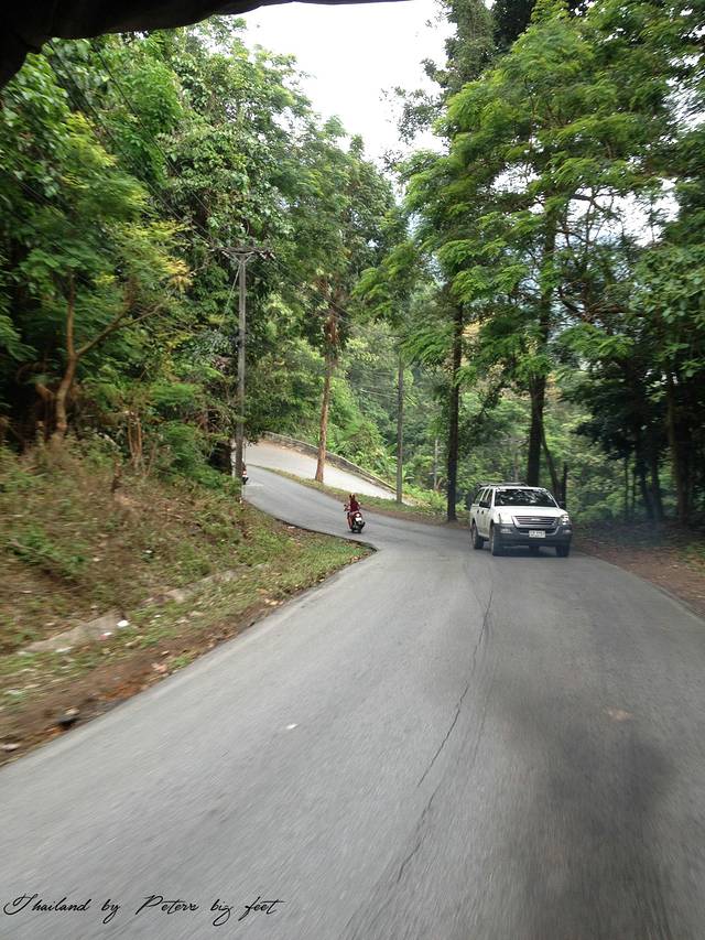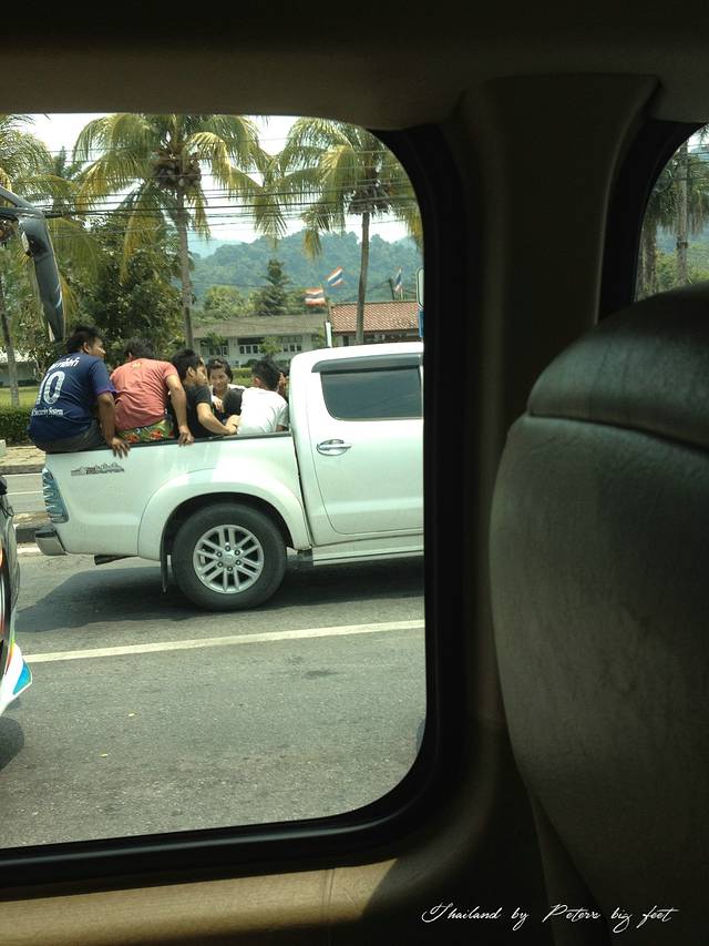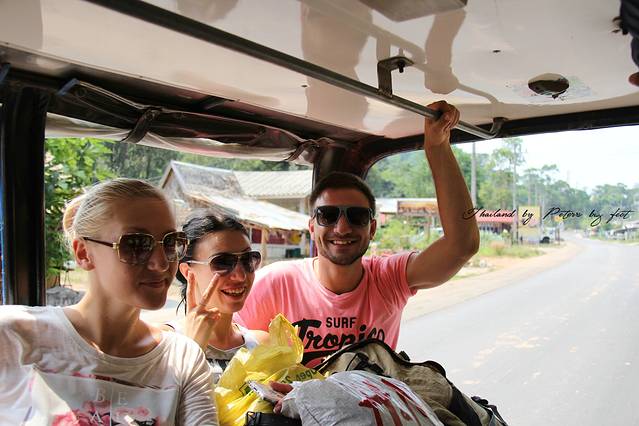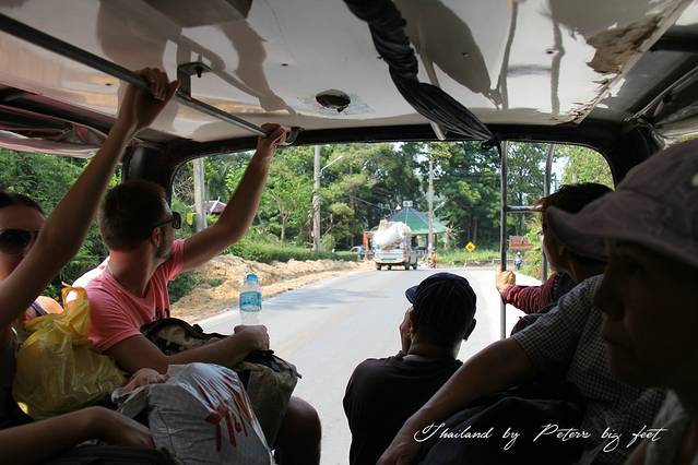 上岸后一群人拼了一辆宋条车走起,除了我俩中国的,还有4个泰国人,1个哈萨克斯坦妹子,一对乌克兰情侣,还有一个日本人带着越南老婆和小孩,这又是一个奇怪的组合。从码头出发南下有一段很险的山路,于是大家都抓紧了把手,有种小小的过山车的感觉。