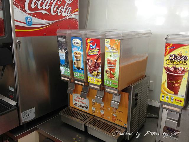 便利店内这种饮料机让我印象深刻,下面有各种大小的杯型,并排四种里右侧那个是泰式奶茶哦,味道很不错,和国内同样杯型的大概折合只要4块钱。最关键的,是顾客自己打满饮料再去付款,也就是说你可以一个个尝过来,甚至可以一口气先喝个小半杯然后加满再去付款。
