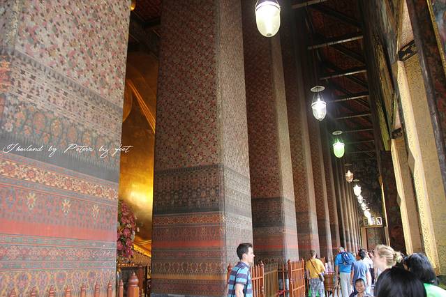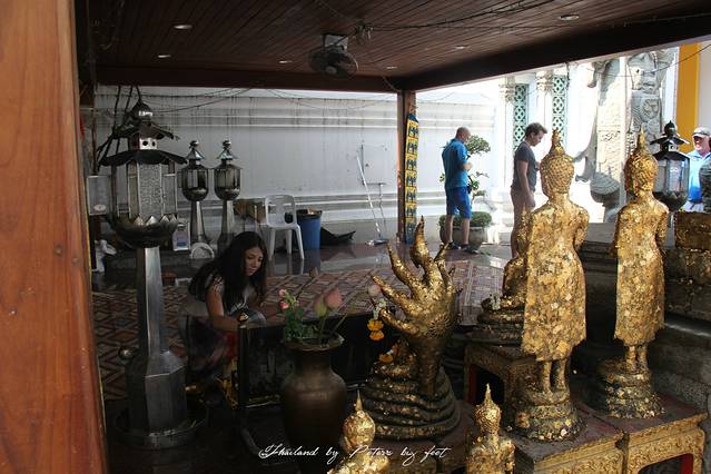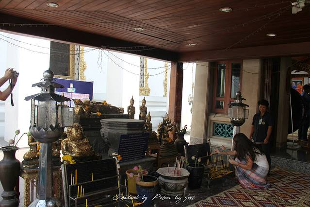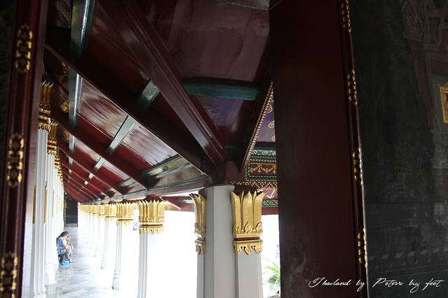 进入主殿内部禁止拍照,有工作人员严密盯着。正好我们也走得有些累了,便进入主殿静静地坐在地上休息一会。主殿的屋顶很高,上面有着各种复杂的图案,坐在主殿内,仿佛真的有一种能量在流动,你可以感受到,一种安静的力量,这大热天浮躁的内心瞬间平静了。其他游客也和我们一样静静地坐着,还有一些泰国人手捧鲜花来到佛像前虔诚地拜着。