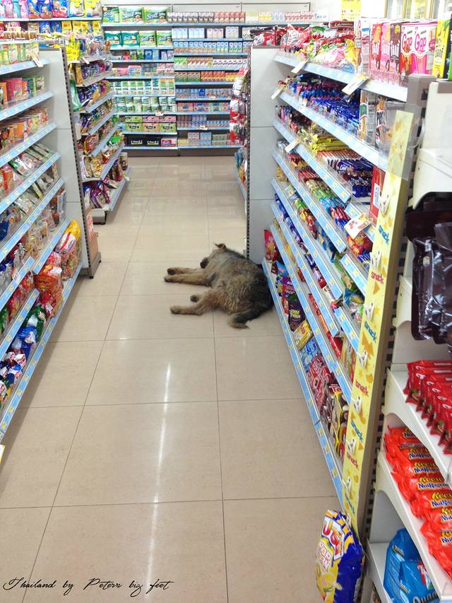 便利店里一只阿汪就这么慵懒地躺着乘凉,也不怕人,更不会凶神恶煞地乱叫。