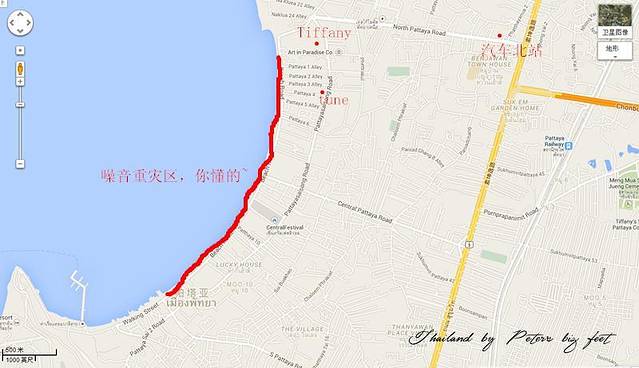 简述一下芭堤雅当地情况。坐的大巴,是到芭堤雅汽车北站,如图可以看到Tiffany、tune酒店的相对位置,从汽车北站下车向西到达tune是有不少路程的(2KM肯定有,且更多的酒店都在tune南面的大片区域),如果大包小包拖箱等到达北站,直接找车过去吧,不然走死你。除北站外,还有些车是到芭堤雅南站的,所以上车前请问清楚到芭堤雅具体哪个位置,如果是到南站,那都会走如图黄色的素坤逸路,请提前了解预订酒店的位置信息,在最近的路口下车。另外红线位置为海滨步行街,预订酒店时请特别留意!这一段半夜2点都是鸡飞狗跳的,选择的tune酒店步行到海滨约5分钟,晚上还是比较安静的。