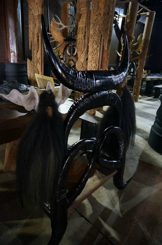 几把犄角、骷髅和兽皮做装饰的桌椅在大堂最显眼的位置,丝毫没有毛骨悚然的感觉却让人肃然起敬.