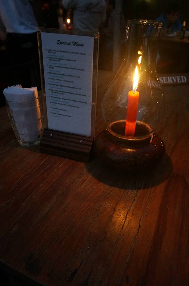 沿河岸摆放了很多餐桌椅,可以选择室内、室外或乘船就餐。我们果断选了在室外,虽然有那么一点点文字,但是为了逼格,忍了!哈哈