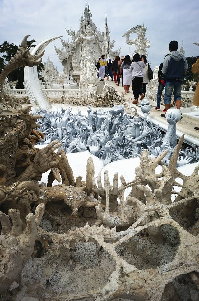 白庙是现代性建筑艺术,但是查大师精通佛法,把现代化和佛教特别完美地结合在一起。白庙最震惊的除了通体全白,还有奈何桥前威严护法,和奈何桥下伸出的骨骨白手,地狱万象。其中有一只中指涂着红色,中指在神秘学文化中很有意味。而且在民间巫术中,中指滴血是大凶诅咒之术,具有很强的感染力,厉鬼之手。
