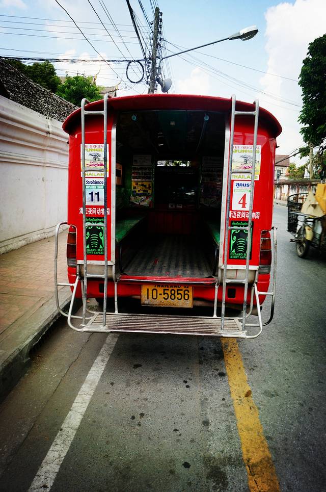 这就是传说中的双条啦,其实就是车厢内左右各一排条凳。市区内能到的地方几乎都是20B搞定,不过要记得砍价哦,虽然就几块钱的事情,可是被宰的感觉还是不太好。一般司机会给你开价30-40B,你要装出一种很领行情的样子,坚定的问他20B,ok?