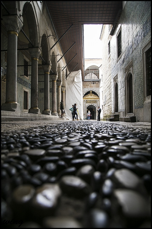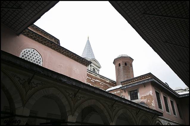 离开地下水宫,我们往旁边的托普卡帕宫这座老皇宫方向走,去看看这座被喻为奥斯曼帝国时期皇宫的表率。到了门口买好门票,去排除安检,安检的大妈要求我打 开背包检查。当时一头雾水,安检大妈把背包里的小脚架拿出来指着旁边放着的一堆脚架,用土耳其语告诉我要寄存。好吧,不能带进去就只能寄存了。本来想去租 一个讲解器,听说整个土耳其只有这里才有中文的讲解器,但想着当时已经下午四点了,离关门时间不多,怕边听讲解边走,会走不完这座皇宫,于是我们放弃了租 讲解器,自己拿着资料边走边看。