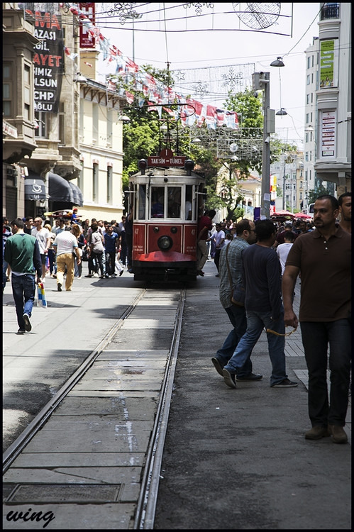 Taksim步行街游客非常多,古老的有轨电车行驶在时尚的步行街上。