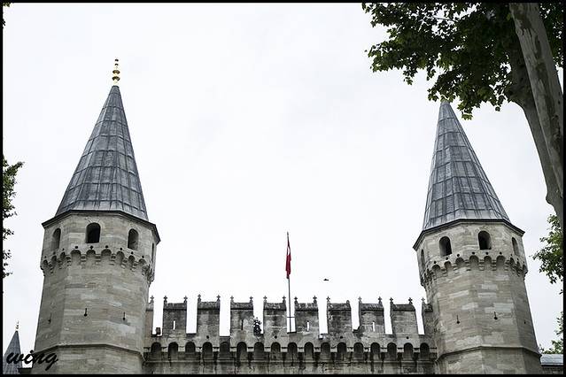 老皇宫不愧是伊斯坦布尔必游的景点,虽然天上一直飘着小雨,但门口排队买票的游客还是不少,鱼去排队买门票,我就在门口拍照片。