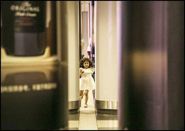 在候机的小女孩,她一个人在这些柱子间玩得很开心。