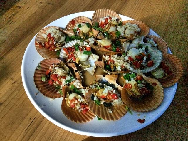 海鲜大餐,鲍鱼,爬爬虾,扇贝,生蚝,青菜,两个人吃了这么多。老板娘说我们战斗力很强,速度还很快,哈哈。