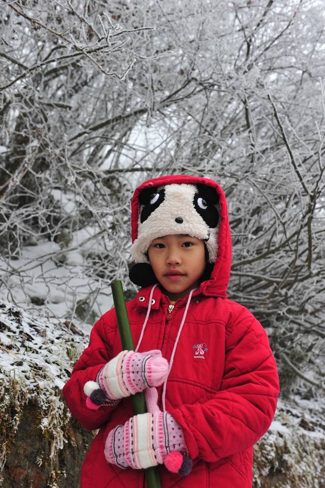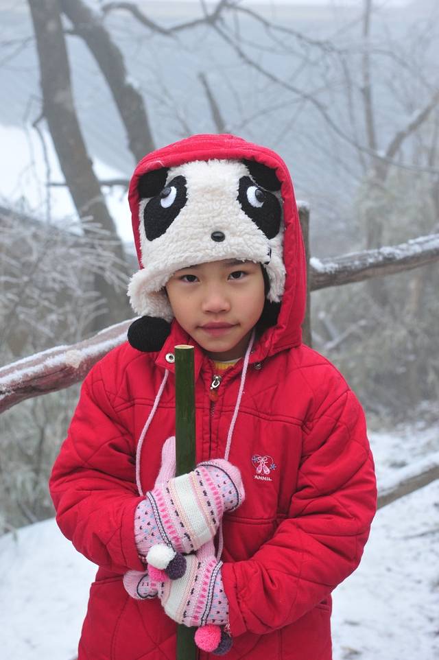 头戴的熊猫帽是特意购置的,也非常映衬峨眉山的特色。