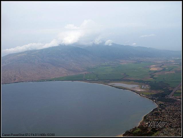 由于前一晚根本就是通宵无眠,所以飞机上赶紧补觉,也没拍什么照片,睁眼的时候,铁鸟已经带我们飞跃太平洋了,从空中俯瞰茂宜岛的时候,有一点小小的失望,心想是因为冬天来的缘故么?怎么一片黄喳喳的,而且是阴天,所以海根本就看不出漂亮。回想到出门前查到的天气预报,心凉了半截。