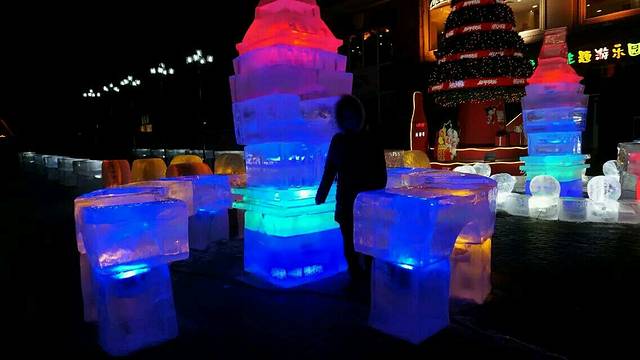 晚上去了冰雪大世界,真的是到了Elsa的冰雪城堡了,好美好美,所有东西都是冰做的,房子,楼梯,椅子,火车,还有冰滑滑梯,美得像在童话故事里。很多都建的跟实物是一样大的,房子里面都是人可以走进去的,床啊,汽车都是按实物大小建的,真的很佩服建筑师们!里面不仅仅是观看的,还有很多玩的项目,玩了些人少的,冰上自行车,冰上滑椅子,有些大的项目人太多了,没有怎么玩。实在不想排队,最后在旁边发现了小雪坡,在上面玩起了滑滑梯。哈哈哈 还是不平的那种。不过很快乐了。