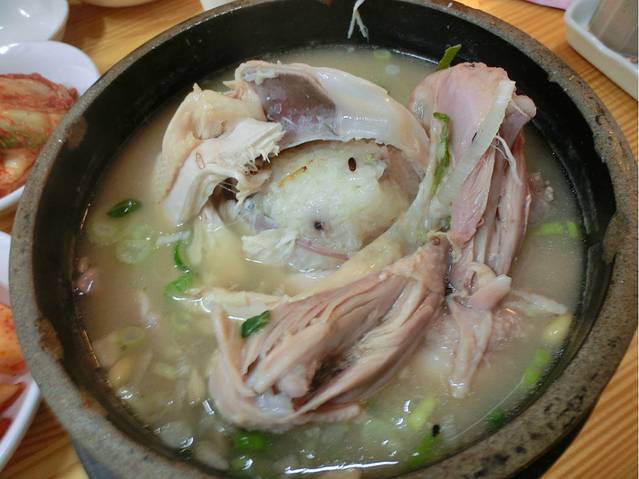 名不虚传 ....用的是一整只鸡炖的汤,里面塞满糯米、红枣、还有一条人参。餐前有一小杯参酒,应该是直接喝的,不过接受无能,我们都倒进汤里了,好好喝~我们两个女生只点了一份,没吃早餐也饱了,还可以留肚子吃晚饭