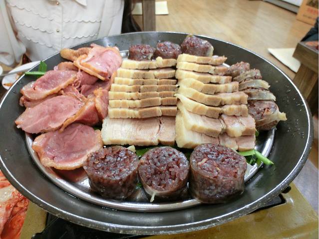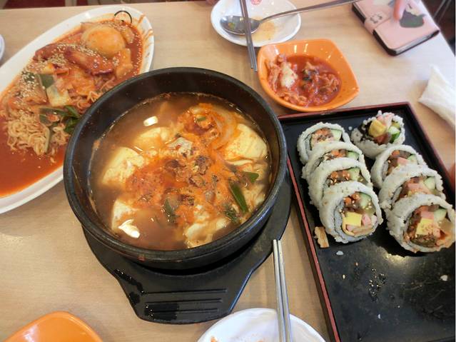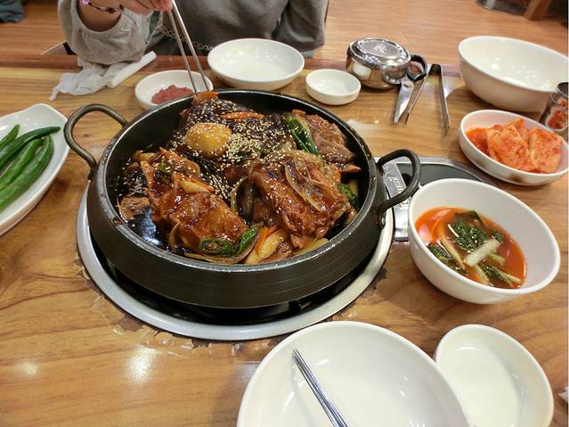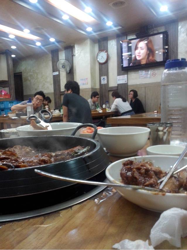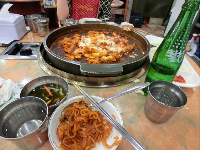超级大一份!但这已经是small size了!里面有6块大骨架,土豆,面条,年糕。分量足够四个女生吃了!味道不错,很入味,有点像乱炖但是味道不同。这家在弘大,24小时营业,没有中文菜单,这种大杂锅有三种肉,价格不同。除此之外也有石锅饭、汤之类的。我们每次回旅舍都要经过这里,所以决定来试试~