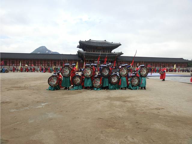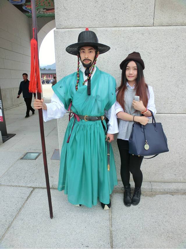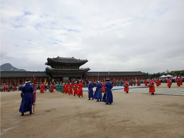 走到了光化门,看到了有特别安排的表演,叫“叠钟”,是宫殿护卫军查阅仪式。这个表演只有2013年9月28日到10月27日每周星期六、日才有哦!时间从下午2:00开始,时长半个小时。想着那么有缘我们就看一下吧~于是那天仁寺洞就没办法去了- -
