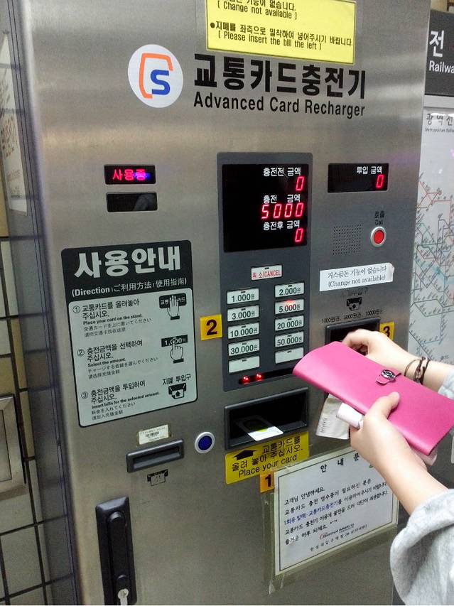 tmoney卡充值机。三个步骤跟着来就好~ 放卡-选择充值金额-放钱