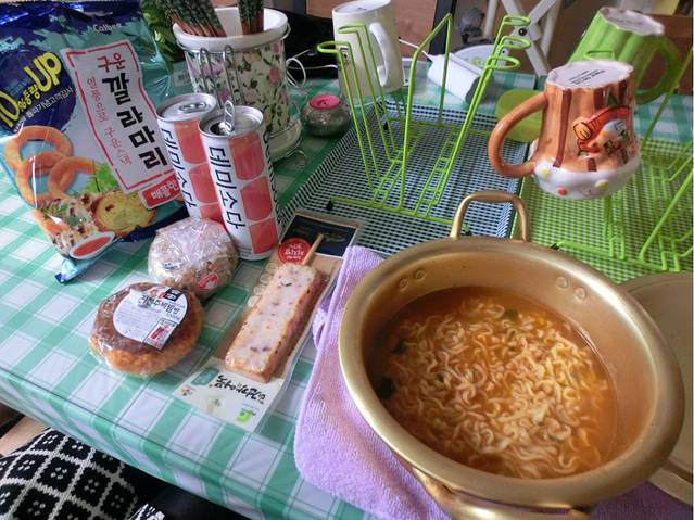 韩国的饮食相对国内的来说比较贵。下图中有紫菜包饭的那一顿即使没有肉total也要差不多90rmb,有肉的就不用说了,普通吃一顿肉人均100rmb打上很正常。购物街有很多路边摊,卖肉串鱿鱼辣炒年糕紫菜包饭什么的,味道蛮好的,但性价比也不高,一份2000-3000won,想想12rmb能在学校吃到撑就泪流满面了。在韩国少不了吃烤肉,不过一般烤肉店都是人头算的,而且都要两份起卖,一个人去吃很尴尬。人头一份烤猪肉是12000won. 吃牛的话再贵一些。那个某偶像团体代言的炸鸡是15000won一份,不过真的好好吃.