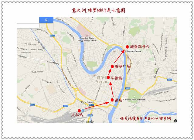 我们的行走路线,酒店--斗兽场—香草广场—城堡观景台—斗兽场晚餐—返回酒店,维罗纳绝对是个非常适合走路观景的城市。