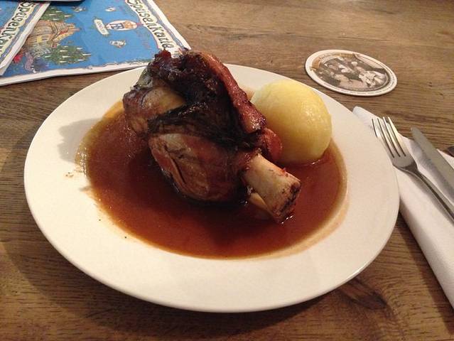 还是坐132路到Marienplatz,走几步就到。点了锦囊上推荐的烤猪肘和啤酒。猪肘一定要趁热吃,我一边玩手机一边吃后来冷了就没那么好吃了。大厅里人超多,吃到一半的时候节目开始了,好多人冲上去照相,我也不甘示弱,正好差不多吃完要走了,就到了最前方录像。