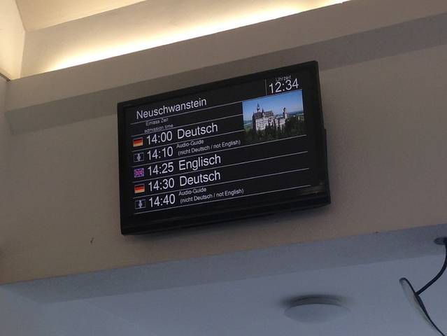 另外各个景点的场次时间也显示在售票大厅的电视屏幕上,不同的场次是不同的语言导览,分为三种,德语英语和语音导览,语音导览包括几乎所有其他非英语和德语的语言,当然了,也有中文。